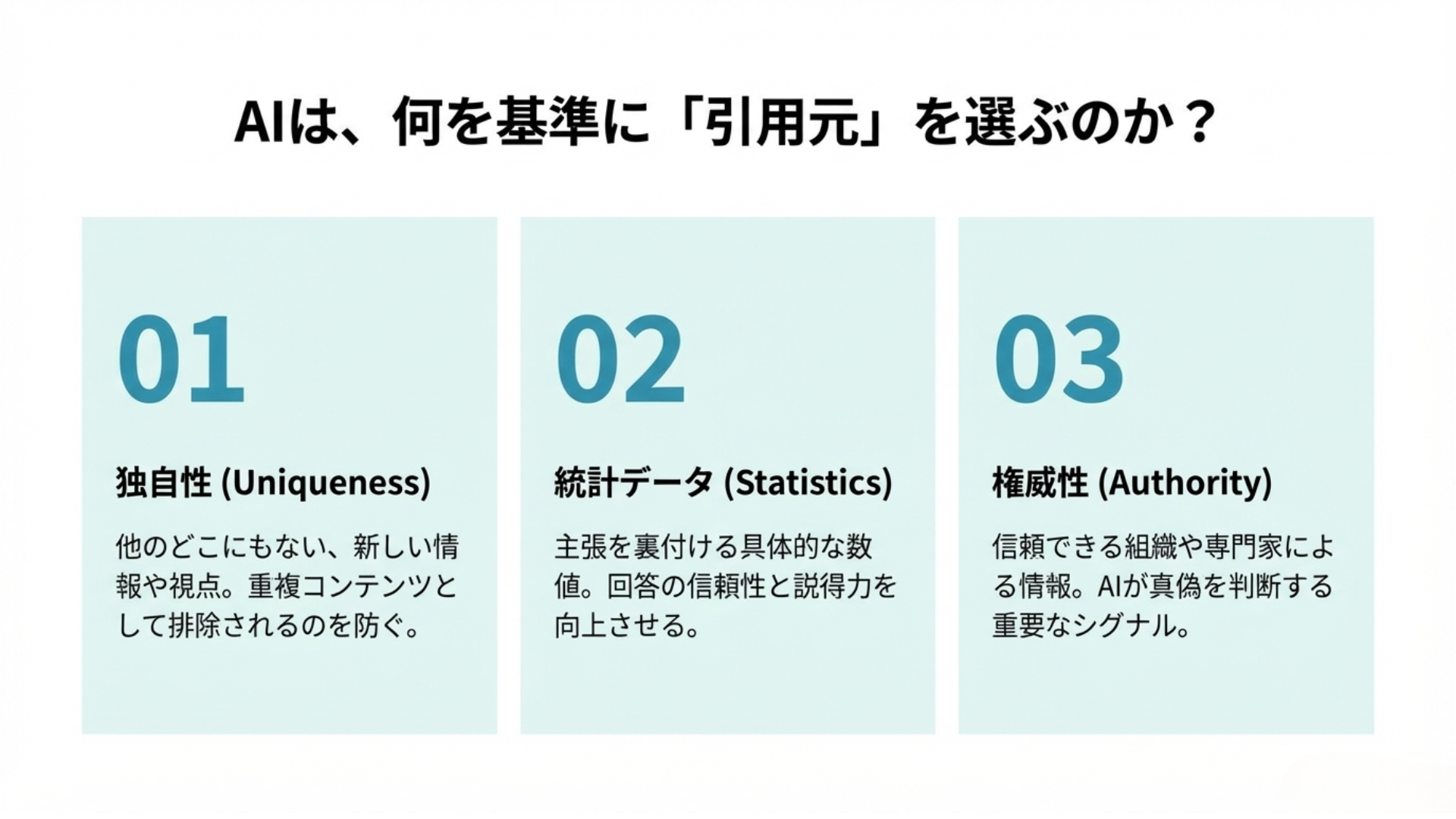 これら3つの要素を兼ね備えたコンテンツこそが、GEO時代においてAIに選ばれ、ユーザーの目に触れる「答え」の一部となる資格を得るのです。