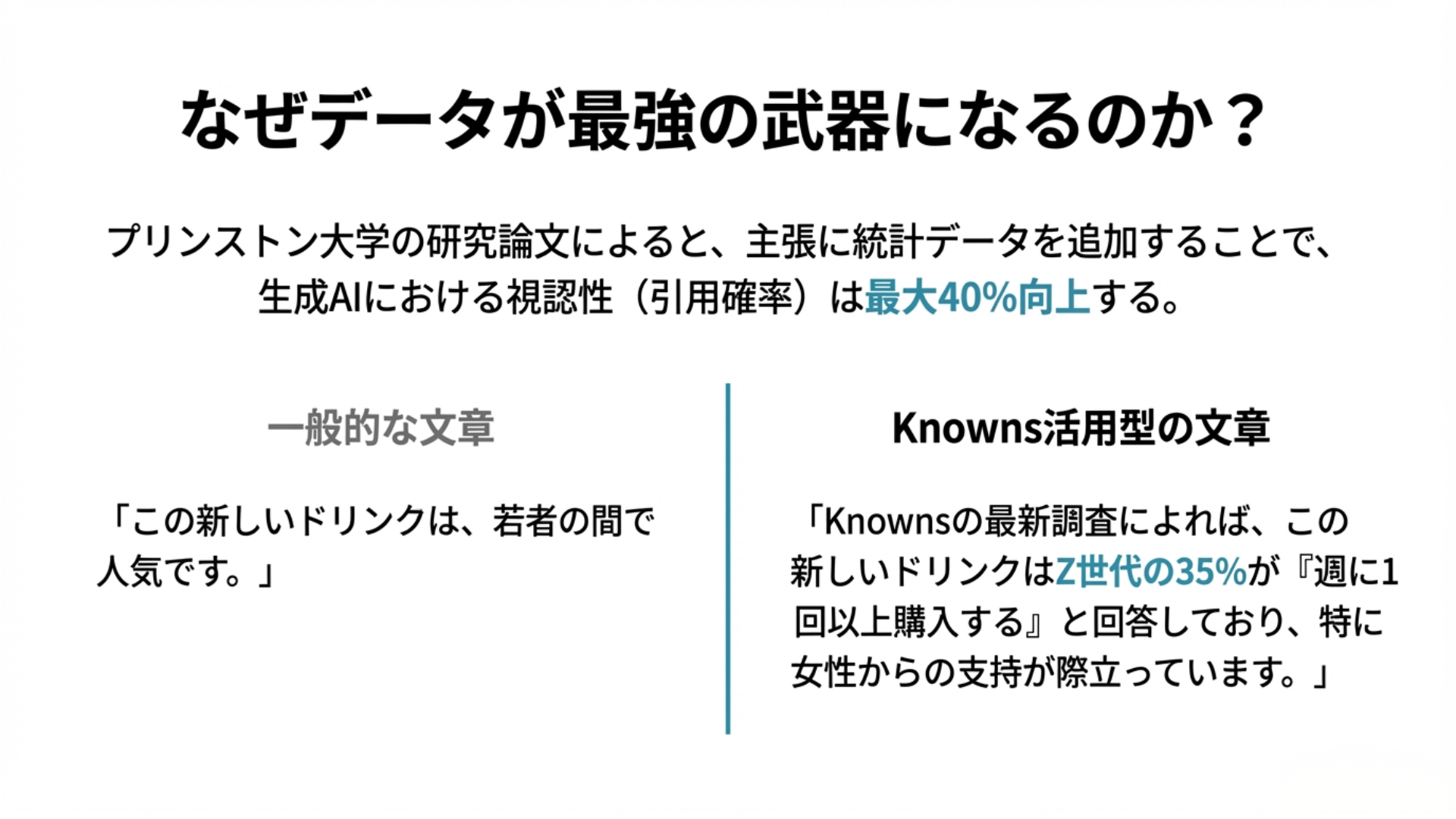 Knownsは単なるアンケートツールではありません。それは、AIが最も好む高純度な燃料、すなわち「信頼できる一次情報」を、オンデマンドで生成・供給する戦略的基盤なのです。