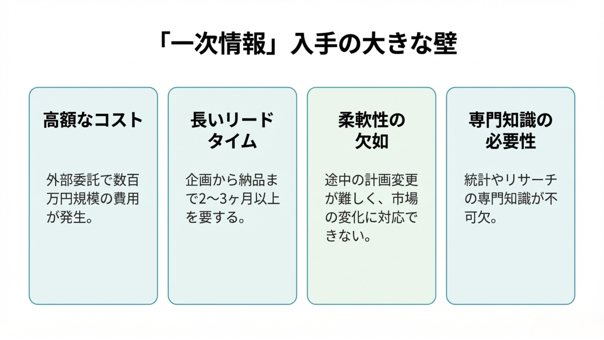 「独自の調査レポートや、詳細な市場分析に基づいたホワイトペーパーを作成すれば、AIに評価されることは分かっている。しかし、そのためには外部の調査会社に依頼する必要があり、数百万円のコストと数ヶ月の期間がかかってしまう。そんなリソースは、うちの会社にはない」。