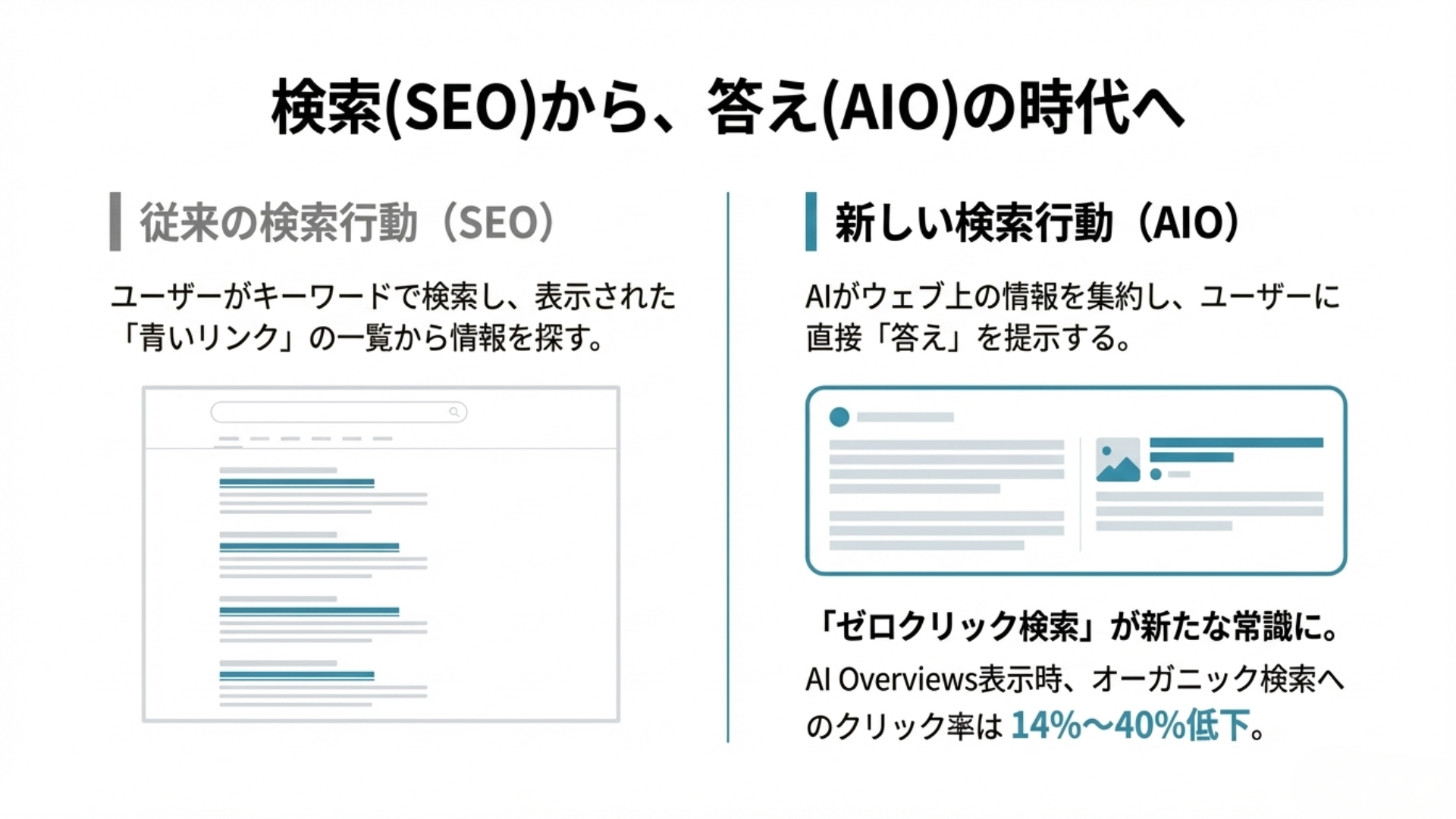 ユーザーはもはや、自ら「情報」を探し回る手間を望んでいません。彼らが求めるのは、AIが瞬時に統合し、要約し、生成した「答え」そのものなのです。
