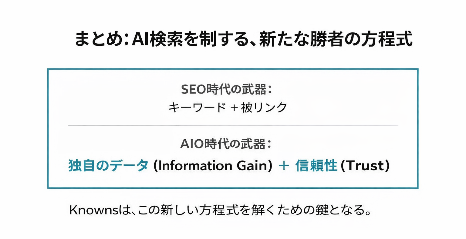 「Knowns」という新しい武器を手にし、質の高い一次情報を戦略的に発信できる企業だけが、AIに選ばれ、ユーザーにその声を届ける権利を手にします。