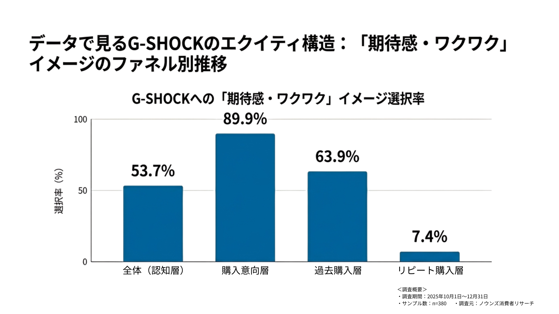 G-SHOCKの「期待感・ワクワク」は、認知層から購入意向層にかけて35%以上上昇しています。 これは、期待感というイメージが購買意欲と強く連動していることを示しています。