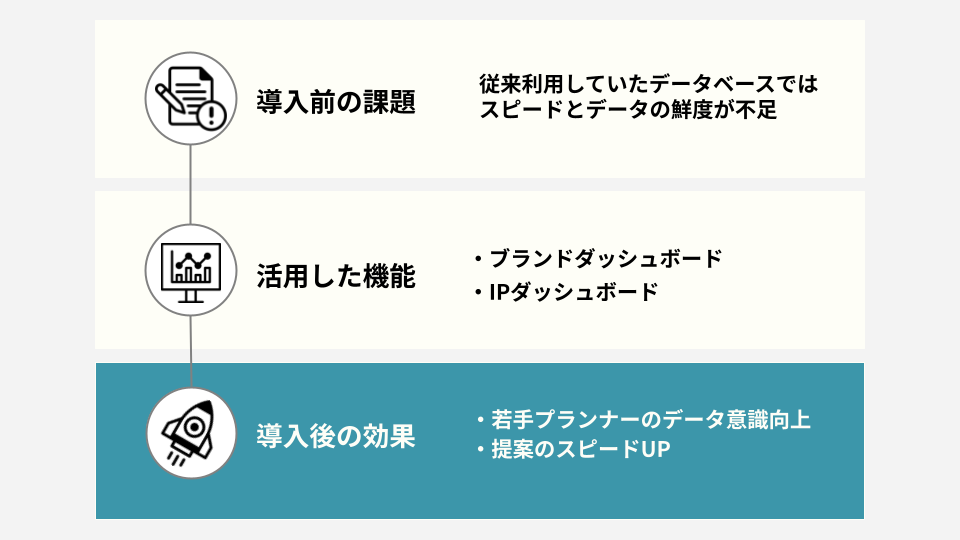 これにより、1から調査しなくても即分析に進めるようになり、IP提案のスピードが飛躍的に上がりました。